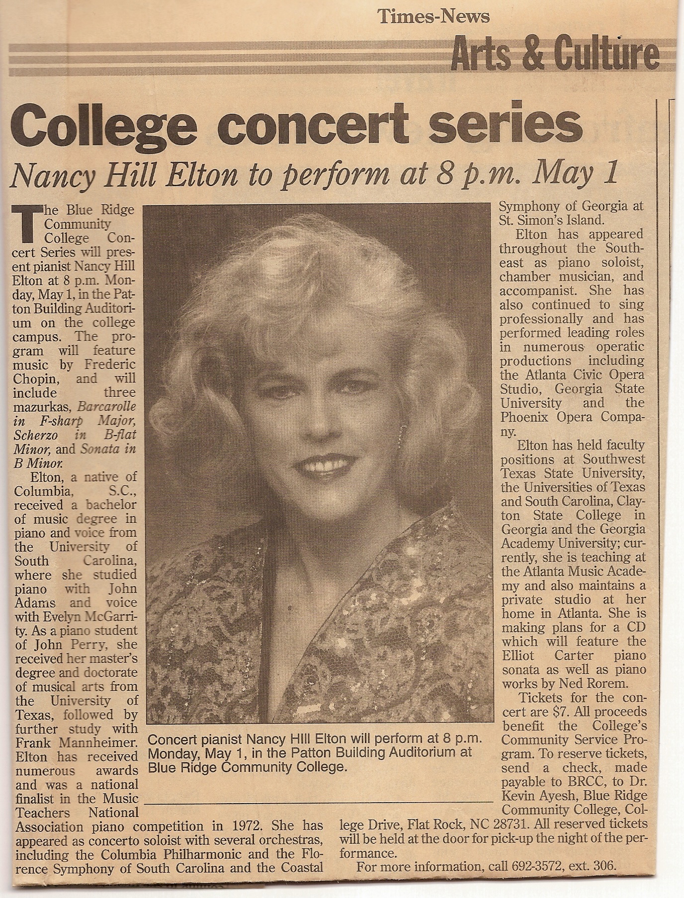 Dr. Nancy Elton maintains an active schedule as a solo piano recitalist, chamber musician, concerto soloist and teacher. Her performances throughout the Southeast and in many areas of the U.S have received critical acclaim. Hailed as "...an artist capable of amazing fire and brilliance as well as being possessed of the most graceful sensitivity and delicacy....a dazzling pianist to say the very least," (The State and Columbia Record, Columbia, S.C) she is a sought after performer and teacher, and many of her award winning students have gone on to major in piano and have successful musical careers. Dr. Elton was inducted in the Steinway Teacher Hall of Fame in New York City, and her name appears on the Hall of Fame Gallery at the Steinway Factory.