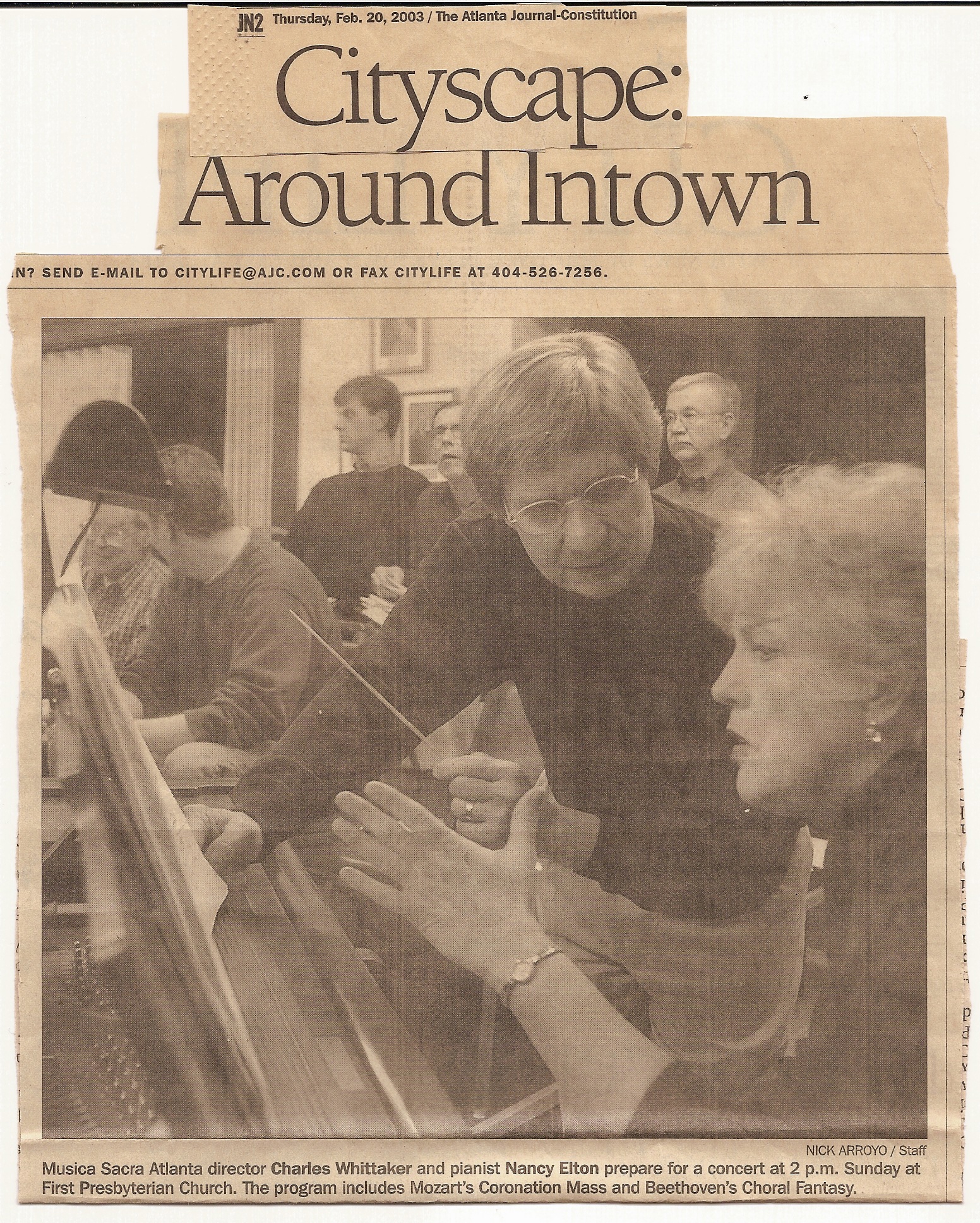 She was also featured as soprano soloist with the Atlanta Symphony under the direction of William Fred Scott, singing Rossini's famous aria, 'Una voce poco fa' for a Youth Concert . She was soprano soloist for 12 years at First Presbyterian Church of Atlanta and a frequent soloist with the Musica Sacra Concert Series. She was also soprano soloist and section leader at Peachtree Presbyterian Church for several years.