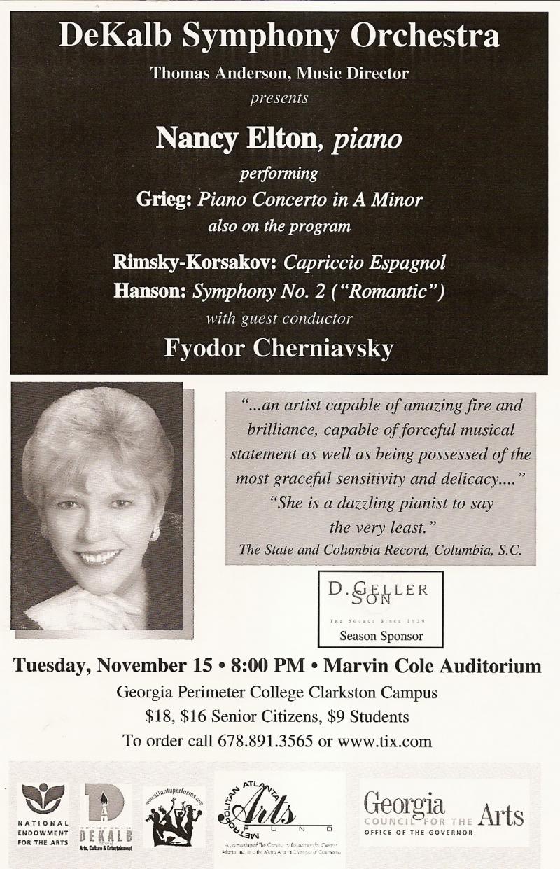 Some of her piano performances in recent years have included solo or lecture recitals for the American Matthay Association at Columbus College, Kennesaw State University and the University of Central Florida in Orlando, and the Univeristy of Kansas where she performed on a piano that belonged to Franz Liszt; solos recitals at Jacksonville State University in Alabama, Erskine College, Due West SC, and Columbia College SC, the University of Georgia, Blue Ridge Community College, Callanwolde Fine Arts Center in Atlanta, Central Congregational Church of Atlanta and Georgia Perimeter College, Reinhardt College and numerous other recitals for church concert series and music teachers associations. Concerto appearances include performances with the Coastal Symphony of Georgia in St. Simon’s, Georgia, playing Beethoven’s 3rd Piano Concerto and Rachmaninoff’s Rhapsody on a Theme of Paganini; Beethoven’s Choral Fantasy with the Musica Sacra Orchestra at First Presbyterian Church of Atlanta and the same work with the Buckhead Community Orchestra, Juan Ramirez conducting. Also included in concerto performances are Grieg's Piano Concerto with the Dekalb Symphony Orchestra and the Liszt Concerto in Eb with the Columbia Philharmonic and the Florence Symphony Orchestra of South Carolina.