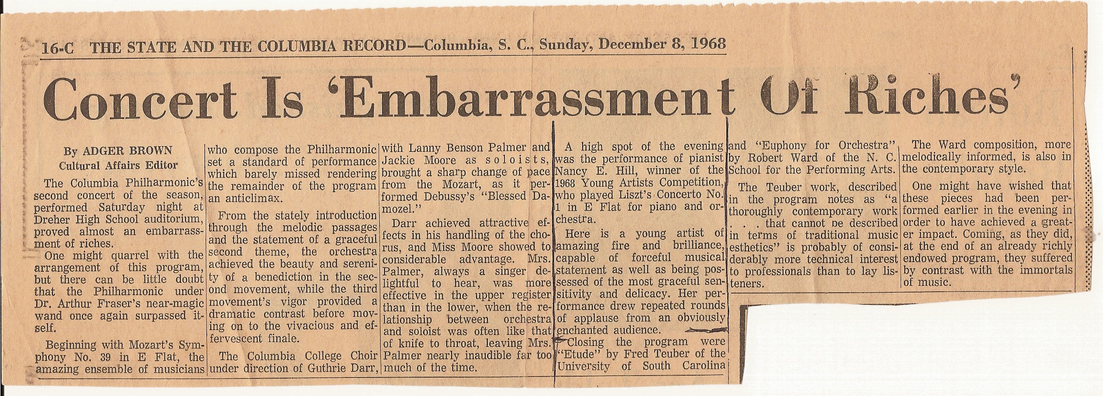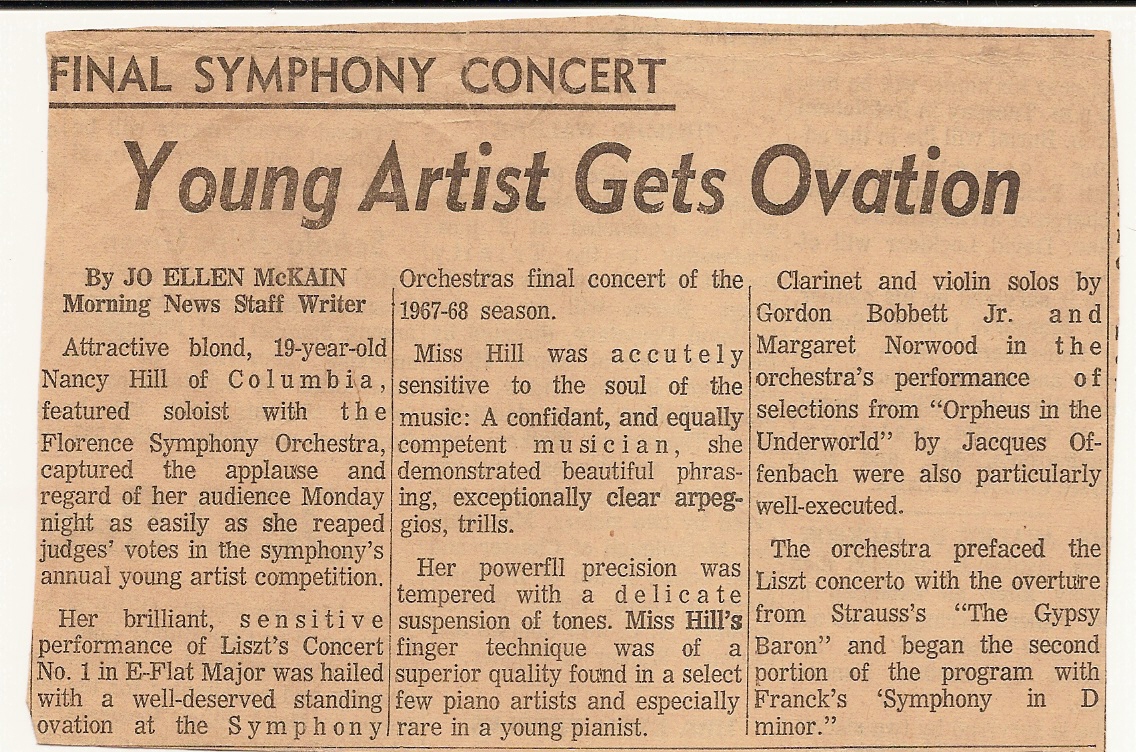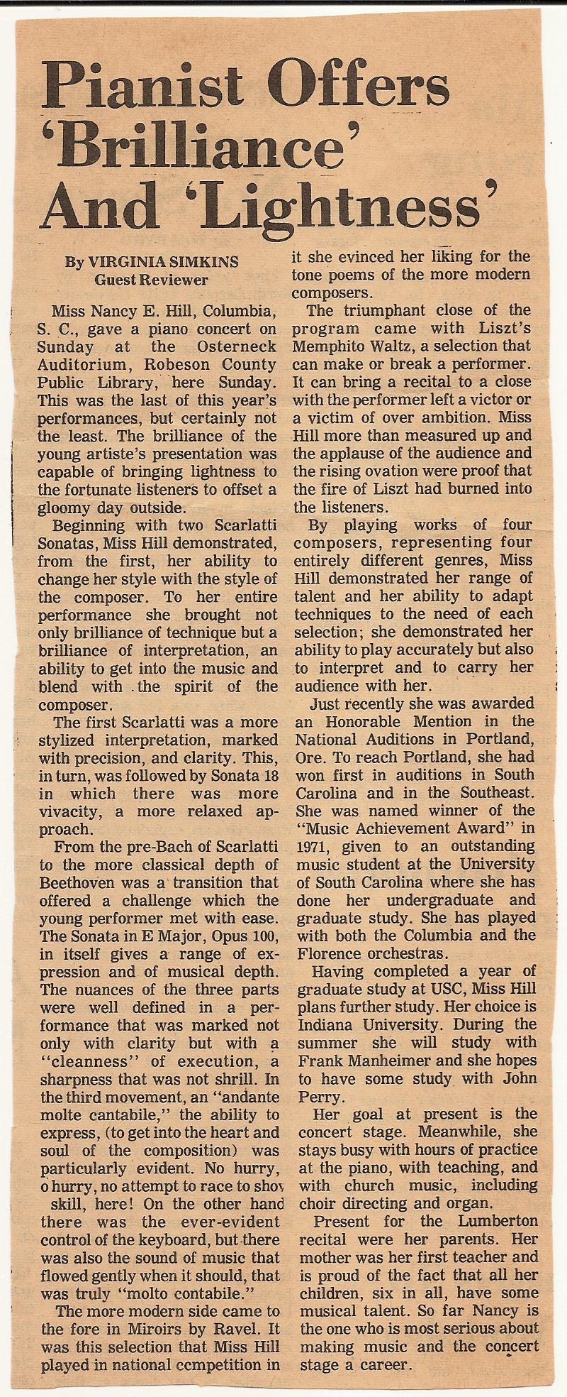 Nancy has enjoyed many successes in her career as a performer. Reviews include statements such as ""she captured the applause and regard of her audience....Her brilliant, sensitive performance of Liszt's Concerto #1 in Eb was hailed with a well deserved standing ovation...she was acutely sensitive to the soul of the music: a confident and equally competent musician, she demonstrated beautiful phrasing, exceptionally clear arpeggios, trills. Her powerful precision was tempered with a delicate suspension of tones...a finger technique of superior quality found in a select few pianists. " Florence Morning News, Florence, S.C.)